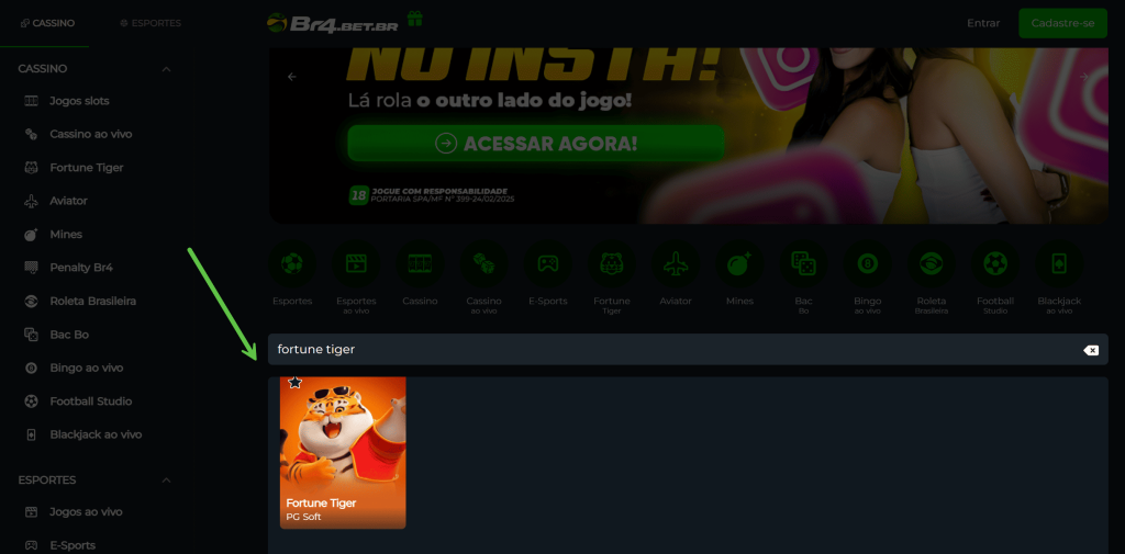 Agora com o valor já creditado na sua conta da Br4Bet, você precisa apenas encontrar o Fortune Tiger na nossa seção de Cassino e começar a jogar.